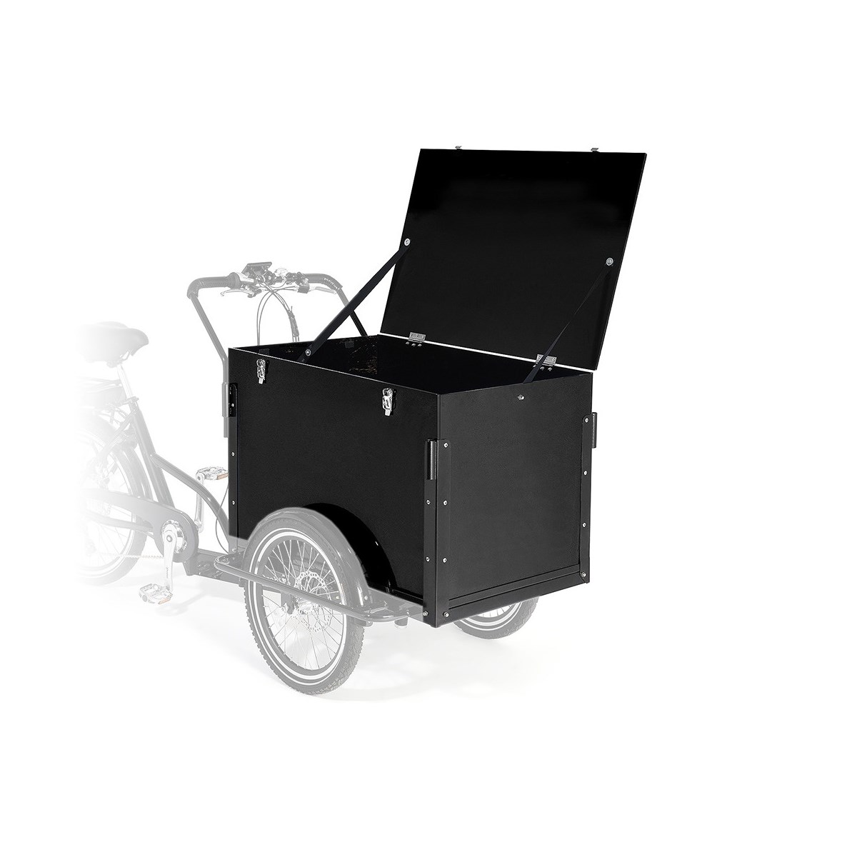Låda med lock "Box" Passar alla Cargobike Classic och Classic Electric och Cargobike DeLight Ink. Lock, sidor, botten, hörnjärn, lås och skruvar.